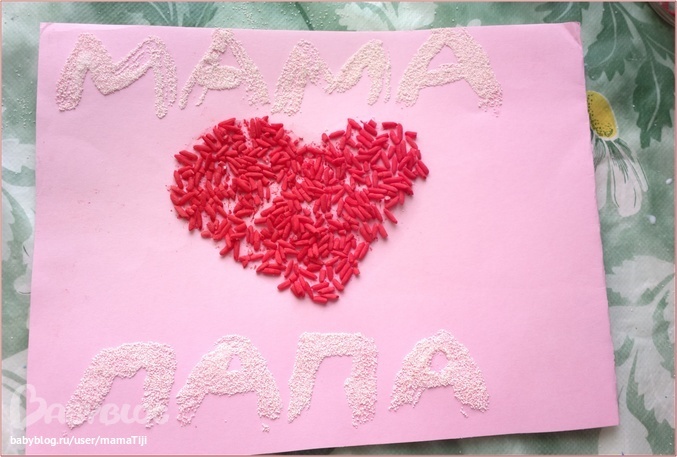 Потом клеем нарисовала сердце, а сынок сыпал на него крашенный рис.