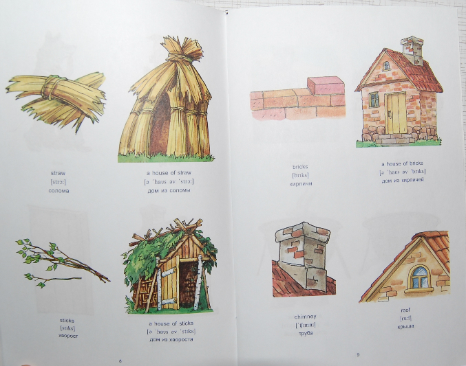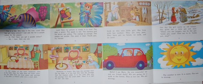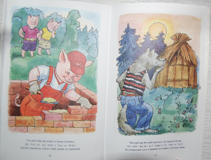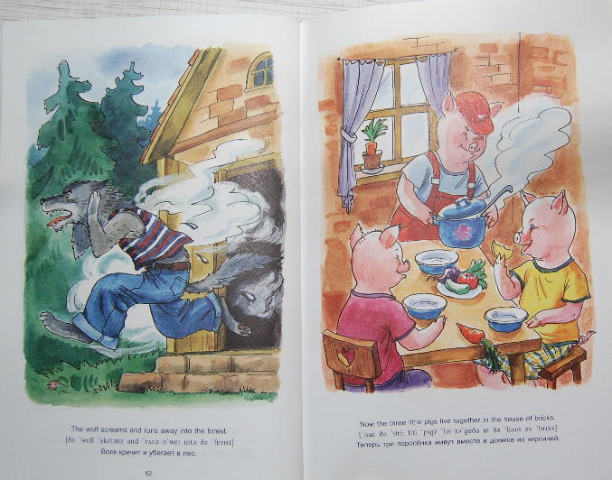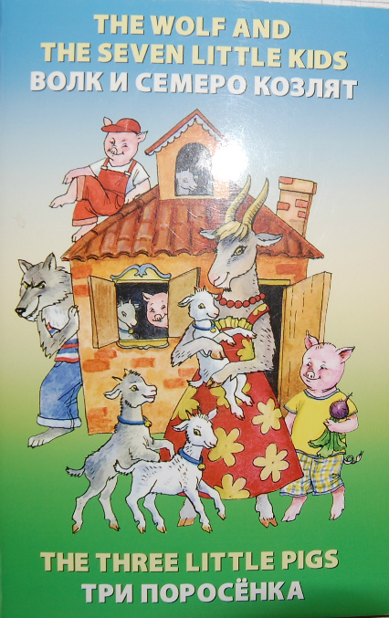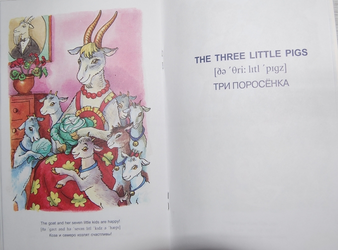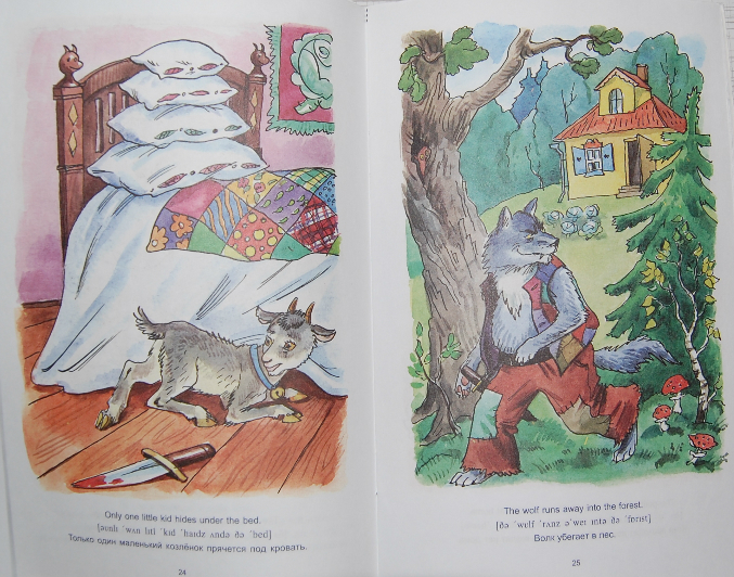 8. Книга, которая мне не понравилась картинками! Особенно где волк с ножом пришел к козлятам, а потом окровавленный нож лежит рядом с оставшемся козленком... Текст - под английским предложением сначала написана транскрипция, потом перевод на русский - очень удобно.