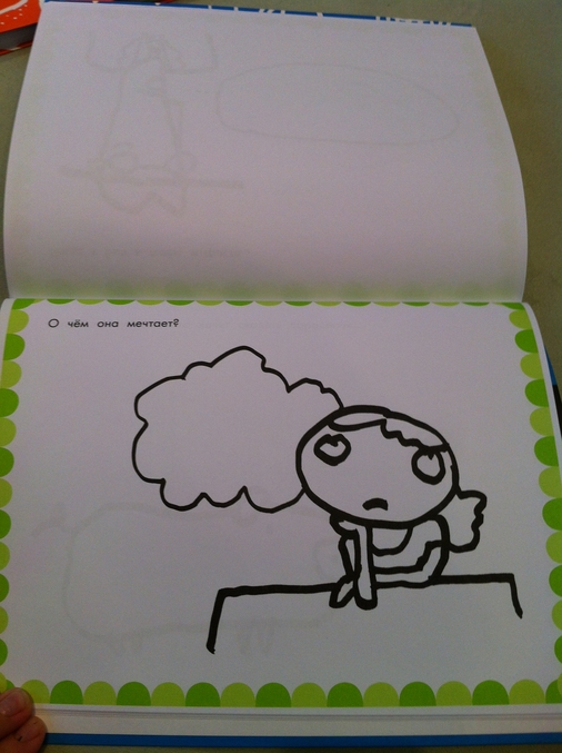 Наконец-то появилось нечто большее, чем стандартная разукрашка! На каждой странице альбома в "детском" стиле нарисована небольшая картинка и дано интересное задание, предлагающее что-то придумать, нарисовать, раскрасить и так далее.