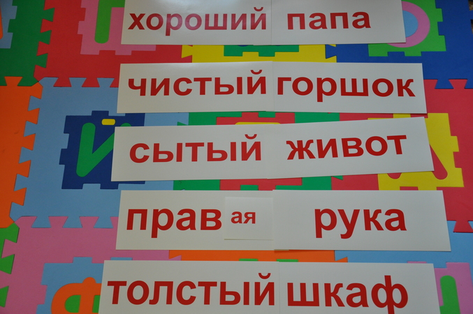 Мне удобно скреплять карточки малрным скотчем - карточки не повреждаются:) Слышала, что мамы используют для этого степлер, скрепки, магнитную доску. Итак, берем три карточки: правый, ая, рука и получаем словосочетание:). Другие составить еще проще:)