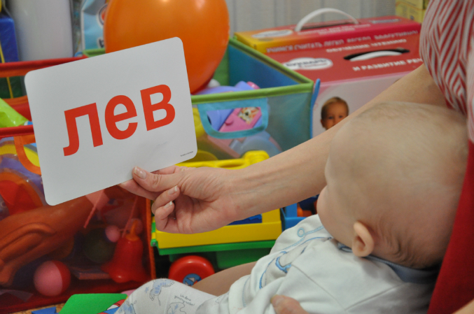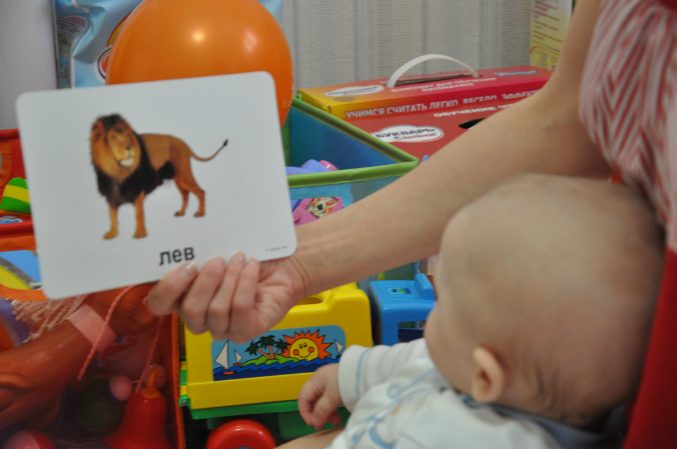 Форма занятий. Раньше, когда Никита лежал и не пытался перевернуться и уползти :), я просто показывала ему карточки, когда он лежал на спине. Теперь мы много играем с карточками - прыгаем по ним, летаем, возим на машинке итд. Идеи для игр я часто ищу в - очень живой форум мамочек, которые занимаются по Умнице.
