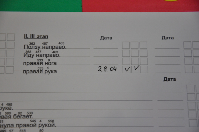 2. 5 словосочетаний. (Начали как раз сегодня). Маленькое отступление о том, как их готовить. В комплекте есть специальный набор с приставками, окончаниями, суффиксами,а также предлогами и союзами. Можно собрать любое словосочетание и предложение:) Часто уже не можешь придумать словосочетание или не помнишь, показывала такое или нет, в помощь - оборотная сторона карточки. На ней и подсказка для показа есть, и отметка, что все посмотрели.