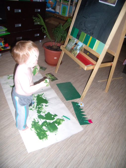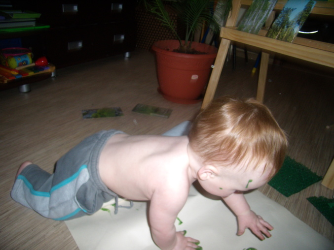 Поглядели на картину " Первая зелень. сделали заключение)) -травка зеленая ( рассмотрели какие оттенки зеленого бывают) а потом ножки побежали по колючей травке (массажик для ступней)