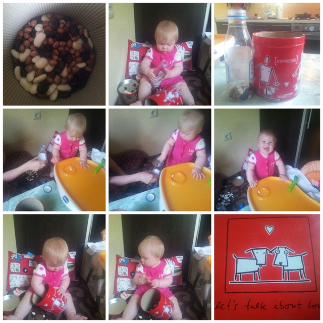 Развитие от 9-12 месяцевНа первые майские праздники, будучи у бабушки на даче, я откопала чудесного вида фасолинки и бобы, почему-то в магазине мне встречались одни уродцы! С тех пор мы с Алисой с ними радостно играли, а тут пришла мне идея дать ребенку бутылку в придачу, и, о чудо, оказалось, что Лись уже вполне умеет не то, что бобы в бутылку складывать, но и крохотные фасолинки. Очень ей это занятие понравилось, под конец мы ещё и ноги в банку засунули, не шутки ради, конечно, а для массажика, а после того как все собрали и закрыли, воспользовались баночкой как барабаном и спели любимые песенки. Кстати, Алиса очень любит, чтоб после какого-нибудь удачного действия ей аплодировали, да и сама с радостью себе хлопает:-) Чтоб любимая девочка не засунула весь реквизит в рот вместо банки, мы ели с ней сыр:-)
