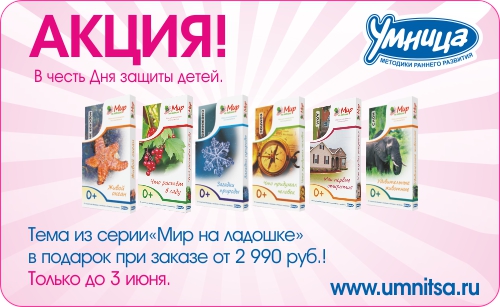на сайте умницы тоже акция там в подарок комплект карточек мир на ладошке дают, но при покупке кажется от 3000 руб