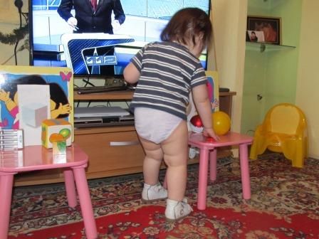 Поиграли немного. сделала дорожку из книг, думала ей будет интересно ходить. ну ей интереснее было книги почитать) Кукол лечили, слушали, ставили уколы, потом купали в тазике их. вытирали и спать укладывали.