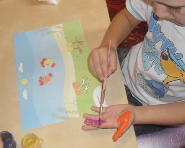 2.Раскрашиваем правую ладошку малыша (если ребенок постарше, то может попробовать разукрасить ладошку сам)