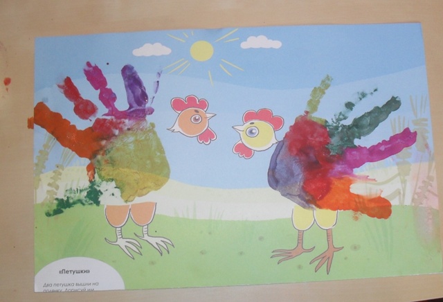 4.Раскрашиваем левую ладошку крохи и ставим отпечатки на правом петушке.