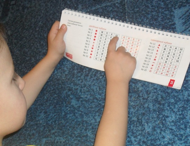 - Назовите обозначение кубика, чтобы малыш его нашел и составил нужный слог. Либо, если ребенок уже понял принцип таблицы, он может сам находить подходящий слог и его обозначение.