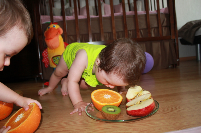 10. Занятия на цветовосприятие, музыкальный слух, развитие тактильных ощущений, игры на узнавание запахов, поэзия и творческие занятия. Мы провели упражнения на тактильные ощущения, на узнавание запахов и на вкус))) Я дала каждой по апельсину, красному яблоку и киви. Все они разные на ощупь. Мы сначала их потрогали активно, покатали по полу, потрясли))) Киви смутил их прям, когда они взяли его в руки. Потом я их разрезала и они сразу кинулись на них - не то нюхать, не то пробывать. Они были в восторге. Они тыкали их пальчиками, лизали, пробывали укусить. Потом я покормила их с ложечки каждым фруктом (яблоко уже нам знакомо, киви показался им кисленьким и они сморщились, а апельсин очень понравился))), и они умчались гонять апельсин пол полу...