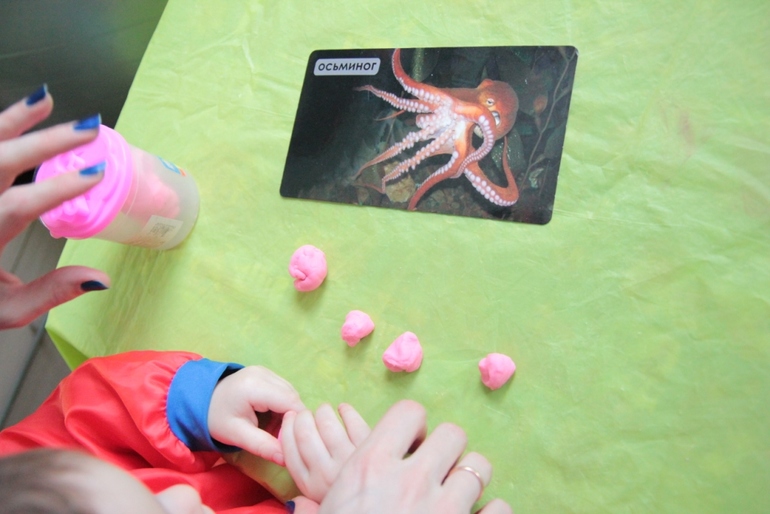 2.Слепите осьминога по заданию из одноименной карточки «Живого океана». Подготовьте 5 кусочков пластилина: один - для головы голову и четыре - для щупалец.