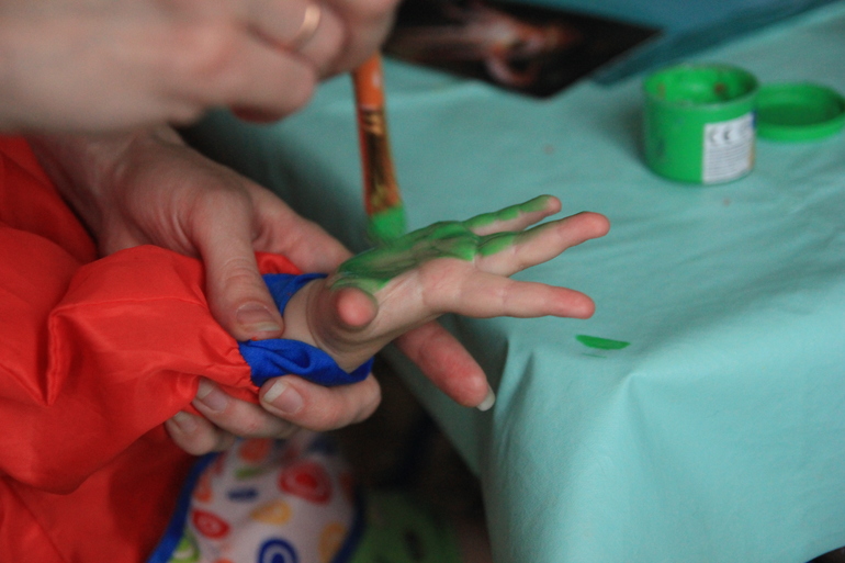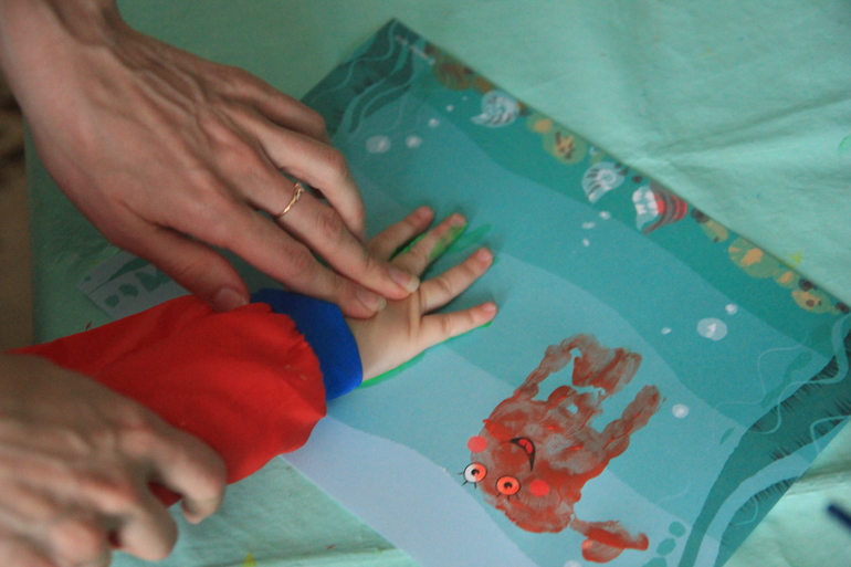 6.Намажьте ладошку ребенка краской и сделайте первый отпечаток его ручки на арт-листе. Повторите – сделайте отпечаток ладошки краской другого цвета.