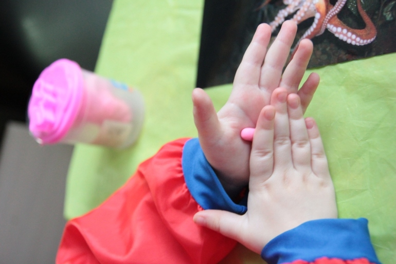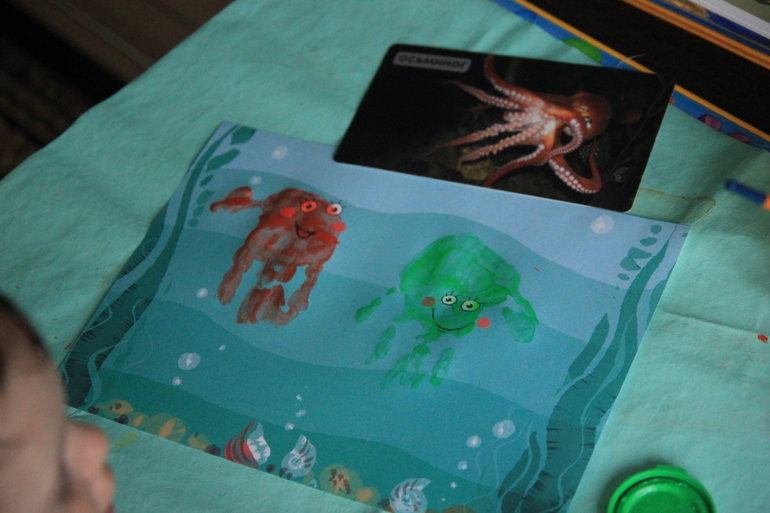 4.Подготовьте арт-лист «Осьминожки», любые 2 цвета пальчиковой краски, кисточку, стаканчик с водой, влажные салфетки.
