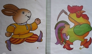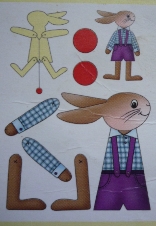 "Веселый хоровод" Книга была разобрана на отдельные странички .Каждые 2-3 дня я вывешивала по несколько новых картинок на стену и проходя мимо озвучивала ребенку кто изображен на них.Позже просила показать того или иного сказочного персонажа. Книга пополнила наш словарный запас,познакомила со сказочными персонажами,способствовала развитию интереса к детским книжкам.В книге есть картонная вкладка и предлагается сделать "пляшущего зайчика".Я не стала замарачиваться и просто сделала большого и маленького зайчика,обклеила скотчем.Дочка какое то время ими играла,очень нам помогали в процессе приема пищи,ела только с зайцами..постепенно обгрызая им ушки и лапки..
