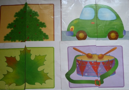 "Сложи картинку" Сразу обклеила все страницы книги скотчем (укрепила),долгое время картинки просто рассматривали,обсуждая каждую деталь.А когда для Яны картинки стали легко узнаваемы,вынула из книги все странички и разрезала по палам.Получилась отличная настольная игра! Прочные карточки и никаких проблем с несовпадением разрезов.Играли до 1,5 лет. Игра способствует развитию логического мышления .