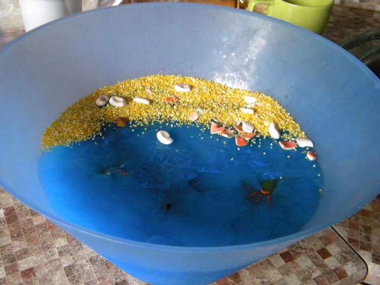 День начался с Северного Ледовитого океана. Вода - уже банальное для бб желе с игрушками внутри, а снег специальный искусственный. В этот раз Федик уже совсем не боялся испачкать руки, рылся в этой массе с большим воодушевлением, а руки вытирал об полотенце.