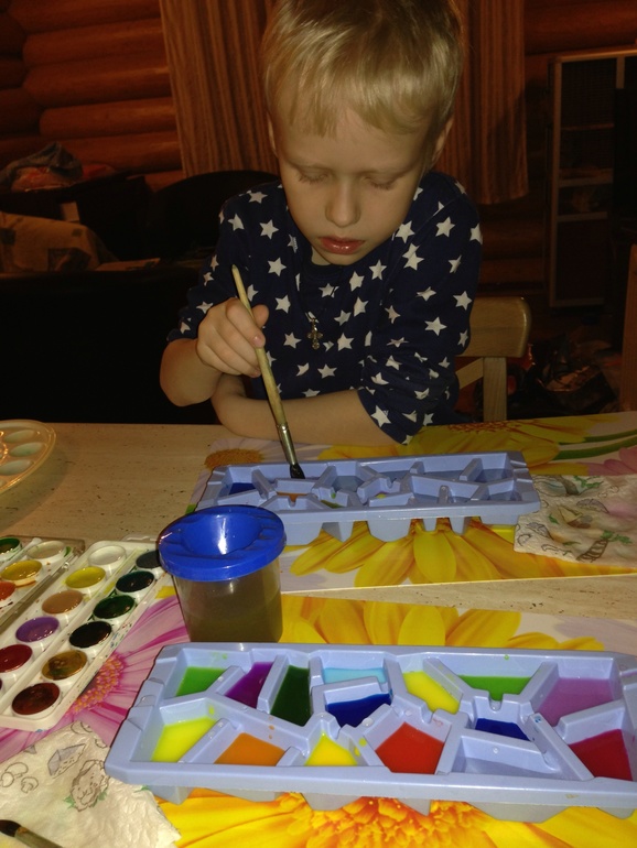 Берем краски, воду, формочки для льда, нитки и кисточку.