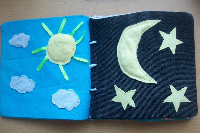 1 разворот: день и ночь. Солнце и луна мягкие, набиты ватой. Лучики - ленточки.