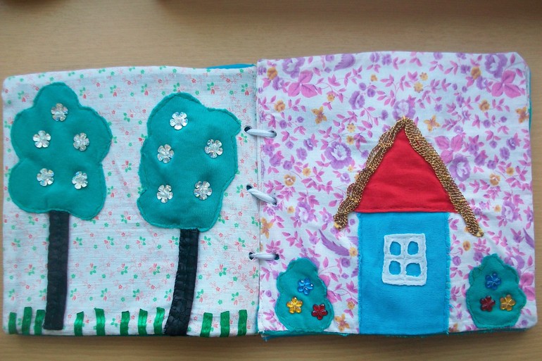 2 разворот: цветущие деревья и домик. Цветочки-пайетки, травка-ленточки, ствол-кожзам. Крыша у домика из цепочки, на кустиках пришивные цветочки.
