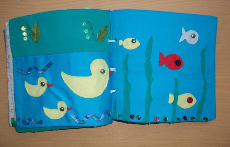 4 разворот: на воде и под водой. На воде плавают утка с утятами, качаются волны, а на берегу растут цветочки - бусины+декоративные листочки. В воде плавают рыбки, есть водоросли и на дне камушки. Глазки у уточек и рыбок - пуговки.