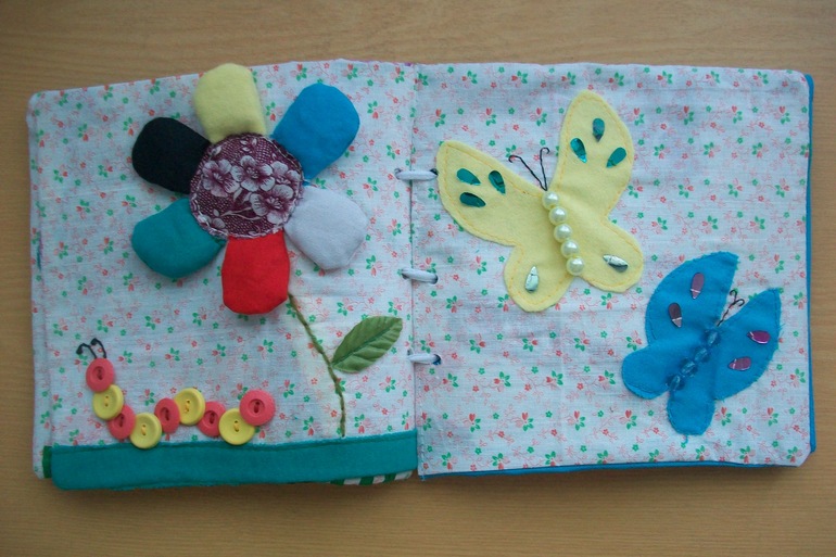 3 разворот: цветок с гусеницей, бабочки. Лепестки у цветка одни набиты гречкой, другие шуршащими фантиками, серединка - ватой + декоративный листик. Гусеница из пуговиц. Бабочки - бусины и пайетки.
