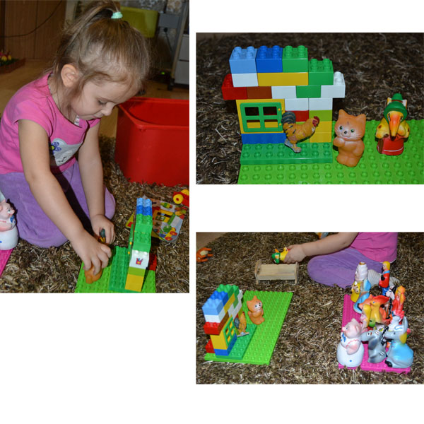 Настена решила, что нашим "бременским музыкантам" мало просмотра мультфильма, им срочно нужно сходить на представление. Вот мы и решили показать им маленький спектакль. Разыграть было решено сказку "Кот, петух и лиса". Зрители заняли свои места, герои сказки готовы, дом построен.