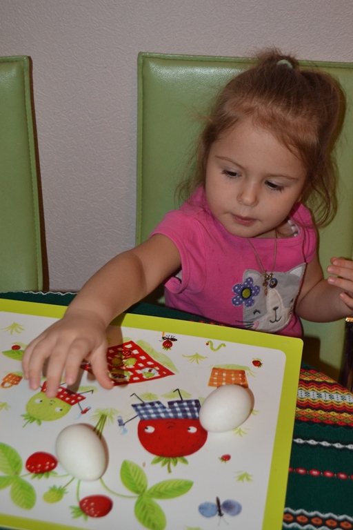 Зайка принес нам много яичек, сказал, что это курочка передала специально для Настены. Вот мы наигрались. И между ручками катали, и по цветам сортировали