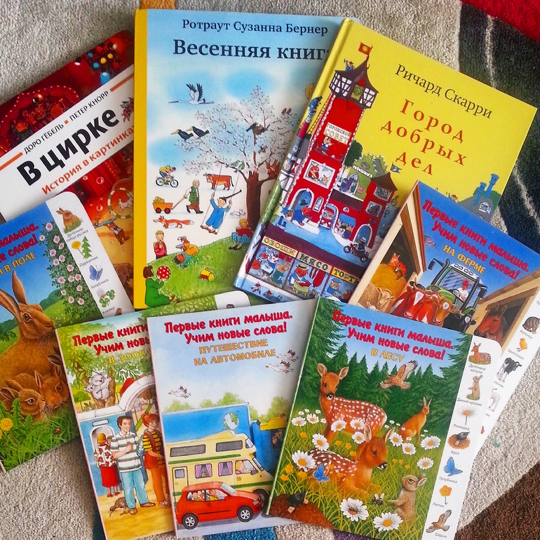 Первая наша книга была "Весенняя" Сузанны Ротраут и сразу очень полюбилась. Дима может долго сам ее рассматривать, отыскивать на каждой странице героев книги, ну и слушать мои рассказы, и иногда поправлять если ему что-то не нравится:)