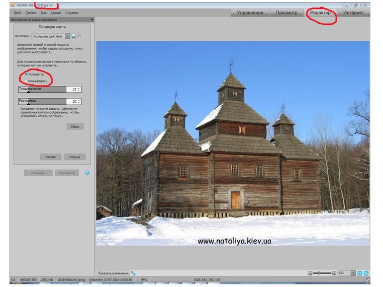 18. Подогнав по размеру в http://pixlr.com/editor/ все картинки по вышенаписанным 4 правилам с сайта Лизы, я проверяю все картинки на надписи, делаю это через ACDSee (скачала программу на просторах интернета). Делаю это с помощью лечащей кисточки либо «клонировать» цвет, либо «исправить», кстати, вот в представленном варианте картинки с церковью, я обычно просто надпись обрезаю еще в редакторе Лизы, когда размер подгоняю.