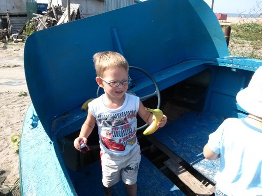 Осмотрелись увидели еще старую моторную лодку залезли и в нее, а там нашли бананы и маркеры.