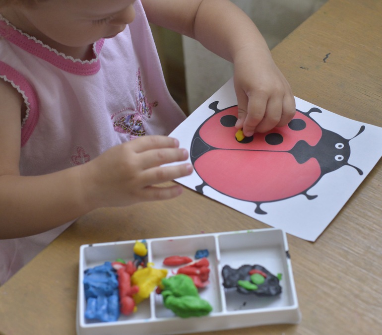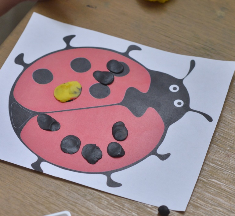 Делали пятнышки божьей коровке. Сначала Маруселька клеила на те, которые были, а потом - уже на свободном месте. В завершении - скатала колбаску, приклеила на мордочку бк и сказала, что это нос!