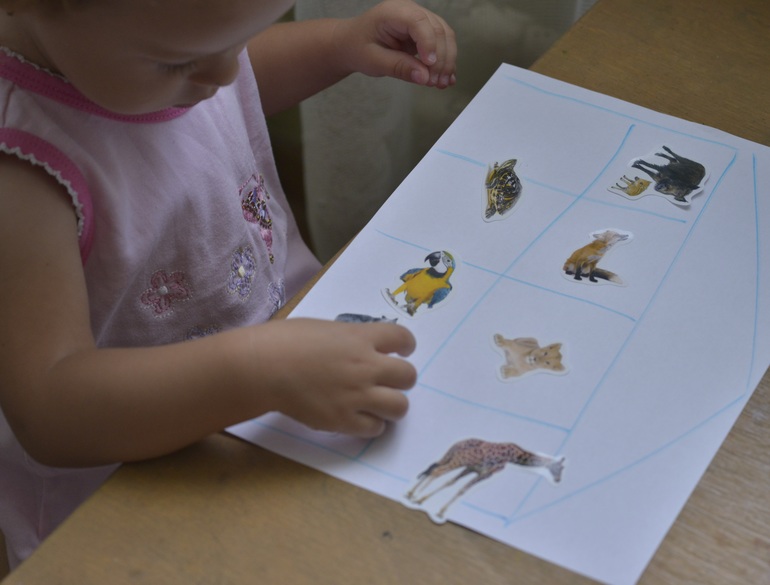 Начали мы с наклеек. Я нарисовала домик, Маруся клеила животных по домам. Получилось очень хорошо. Для всех нашла свой домик и прежде чем наклеить следующего животного, искала - где свободно))