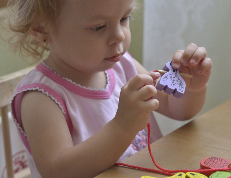 Делали бусы. Маша очень хорошо умеет их делать. А сегодня мы играли так - я говорила, какую детальку взять следующую, Маша ее брала и надевала)