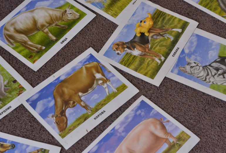 Вспоминали всех домашних животных. Сначала, когда я раскладывала по карточке - Маруселька называла каждого. Потом достали фигурки наших животных и раскладывали по карточкам. Здесь процесс занял уже продолжительное время, тк карточек много, терялась. Но справилась со всем сама, и заодно вспомнили, кто и как говорит)
