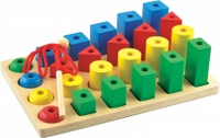 Или от Melissa and Doug. На мой взгляд, еще интересней)) он состоит из 2 частей: сначала нужно расставить по возрастанию кубики с отверстиями, в которые потом опять же по росту надо расставить столбики))) а для совсем малышей можно давать просто, как сортер: один кубик и один столбик))