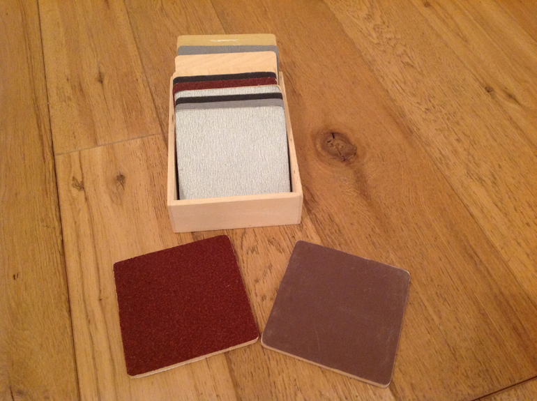 Сделала, наклеив наждачную бумагу разного типа на дощечки. Вообще они парные и идея изначально была найти пару на ощупь, но вирджи пока не дает завязывать себе глаза и мы просто сравниваем разные степени шероховатости. Здесь же напишу, мы еще очень часто рисуем мелками на наждачной бумаге.