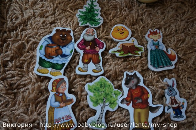 Можно разыгрывать сказочные спектакли на холодильнике или магнитной доске. В наборах есть пенек, елочка, березка, печка-пазл, самовар. С этим дополнением можно и самим придумывать сказки, отклоняться от заданного курса.