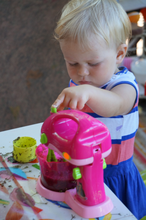 Развитие детей второго года жизниНа днях нам подарили детский миксер. Про наши кухонные и стиральные дела я уже писала ранее, а теперь эта тема неожиданно продолжилась. Сначала миксер показался мне совершенно бестолковым - 1 кнопка, включил, пожужжал, выключил, но стоило дать ребенку в миску какие-то ингредиенты, как тут же это вылилось в ролевую игру "повар". Сначала Маша старательно взбивала воду, потом сливки из баллона, потом воду со своими "нюхательными" приправами, получался суп, которым стоило всех угощать. Одним словом, никогда не знаешь, чем обернется новая бесполезная игрушка.
