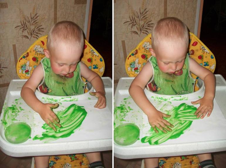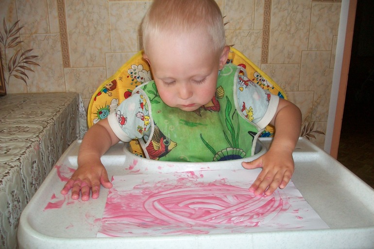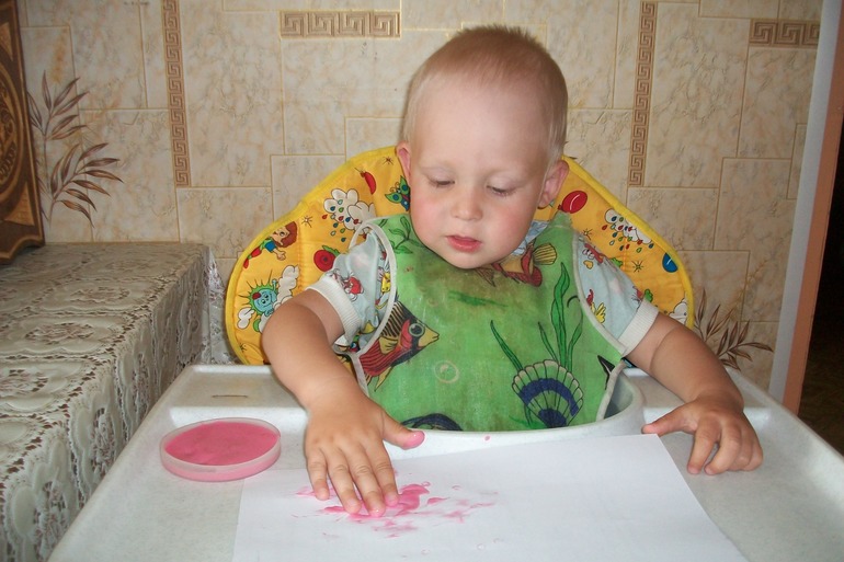 Развитие детей второго года жизниНаконец-то сын "созрел" до пальчиковых красок. Раньше давала ему, но ему было не очень интересно. Так и стояла баночка с пальчиковыми красками в холодильнике неизвестно сколько долго. И вот сын показывает в холодильнике на них, мол, хочу. Достала ему, показала, что да как. Дала рисовать ватными палочками - он потыкал немножко и убрал палочки. Показала, как оставлять следы от "штампа" - тоже не захотел. Потом сам вылил крышечку с краской на бумагу и стал по ней пальчиками водить туда-сюда и размазывать
