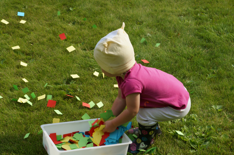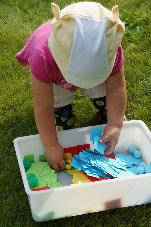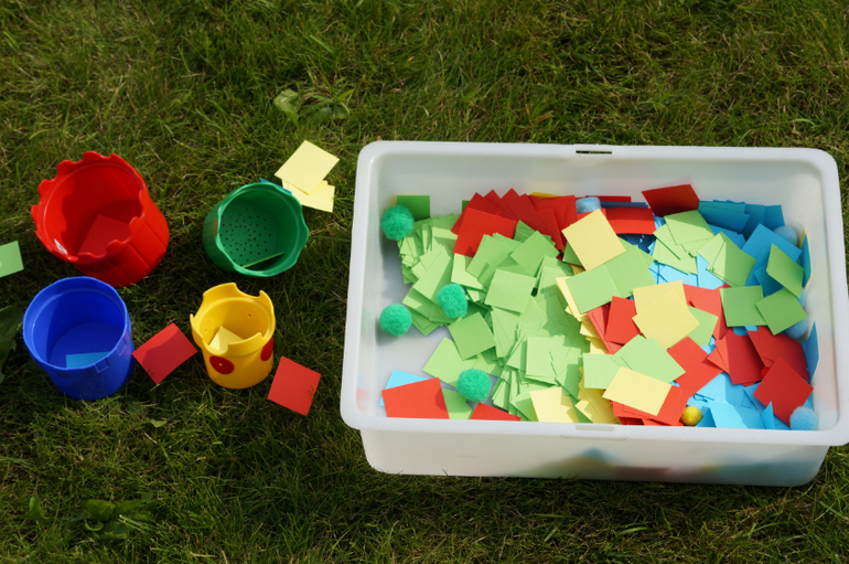 Давно собиралась сделать бумажную сенсорную коробку, идея очень простая - пачка разноцветной бумаги для принтера нарезается кубиками, укладывается в коробку по цветам. Можно добавить интерактивных элементов - у меня были помпоны. Хотелось отсортировать и по изучать цвета, НО не тут-то было!Маруся стала делать салютики, радоваться,веселиться, как положено при виде таких ярких элементов. Итог - нескучный газон, как будто весь в цветах, и море эстетического удовольствия. Этот вариант будет требовать меньше уборки, если играть дома на полу, тк пространство будет ограничено.![]()