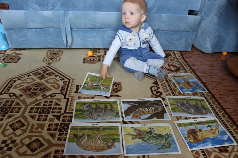 Началось все с того, что я периодически показывала сыну карточки по методу Шичиды. Косте это занятие всегда нравилось. Но однажды он стал проявлять к карточкам большой интерес. Сам просил их достать, показывать ему и называть, что изображено. Потом мы стали их раскладывать по несколько штук и я просила его найти, например льва и т.д. Он с удовольствием находил и радовался своим успехам. Такая игра стала ежедневной, количество карточек начало заметно увеличиваться. Сейчас у нас в активном пользовании 8 комплектов карточек плюс еще карточки Школы 7ми гномов (различные животные, насекомые,овощи и фрукты, транспорт, игрушки) всего где-то около 150 карточек, все знает наизусть, максимум раскладываем по 16 карточек в раз. Самая любимая карточка - буйвол (Костя говорит "бу"), очень ему нравится это животное, а еще кабан, игуана, тюлень... интересные предпочтения ))) Готов играть с ними по полдня, книги правда у нас еще теперь в почете, остальные игрушки тоже периодически вспоминает, так для разнообразия )) Сейчас правда уже приелось то, что есть, надо новые покупать или печатать.
