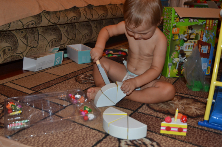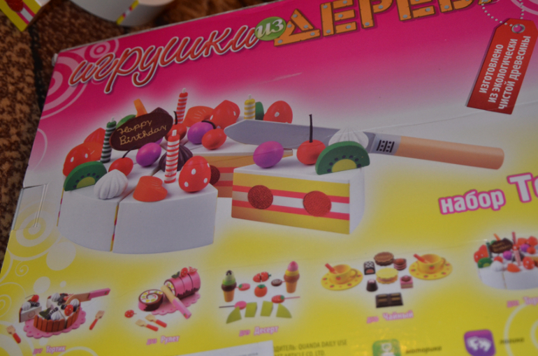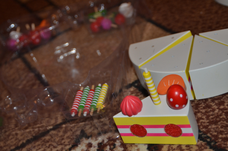 А на будущее - это и считать кусочки (уже немного считаем), и делить на определенное количество, и дроби наглядно. Вообщем, хорошая игрушка. качество нормальное, липучки пока держат, сам торт - это такой киллограмчик дерева:))