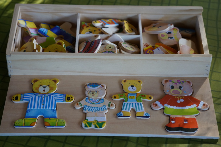 7. Лото - одень мишку. Нам его недавно подарили. Идея шикарная, тут и семья, и эмоции, и мода, НО на мой взгляд, одежда слишком ляпистая, Маше не понятно пока, что к чему. Возможно, бывают другие вариации, где красные штаны нужно подобрать к красной футболке.