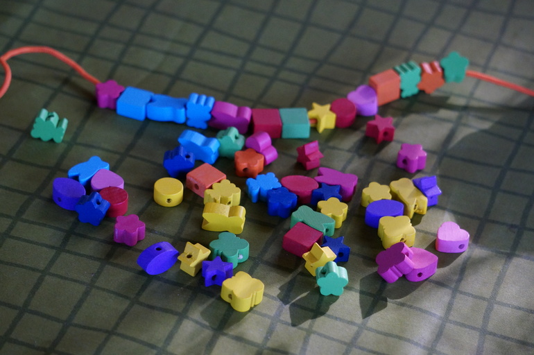 10. Бусины со шнурком. Купила готовый набор. Отверстия не очень большие, продевать сложновато, зато яркие и с разными формами. Использовала их в сенсорной коробке, ну и просто так, конечно.