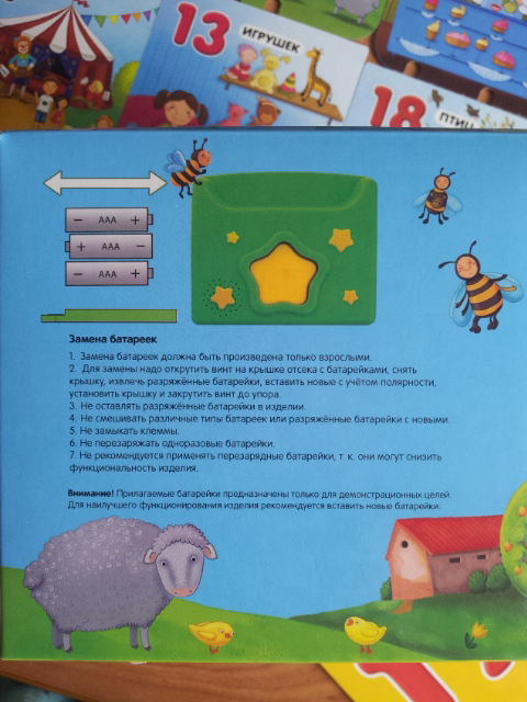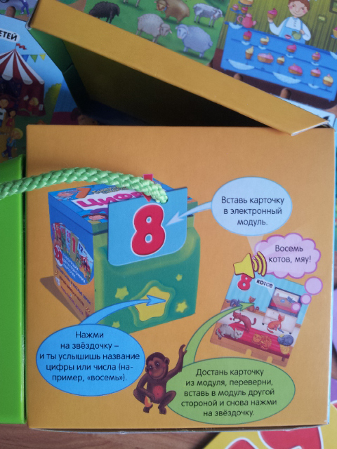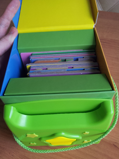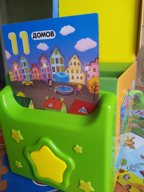 О качестве: размер 12.5 см на 14.5 см - в ширь чуть толще из - за пластиковой основы с кнопкой. В руках 3-х годовалого ребёнка сундучок кажется очень внушительных размеров.Работает от 3-х батареек ААА - сменные(в комплект уже входят).Карточки достаточно жёсткие , гладкие , с приятными для глаз , не кричащими картинками. В сундучке вы найдете 28 карточек с цифрами и числами - да не простых, а говорящих! Чтобы карточка заговорила, ее надо вставить в специальный пластмассовый «кармашек» на сундучке и нажать на яркую кнопку-звёздочку. Карточки можно вставлять обеими сторонами: с одной стороны озвучиваются цифры и числа, с другой - слова-примеры и забавные звуки. После занятия их очень удобно сложить в компактный сундучок.Сын уже сам определил место обитания для своего сундука))))и не дай бог поставит мама его не туда - отругает ребёнок)))Вот так всё серьёзно)))Осталось только с цифрами разобраться))