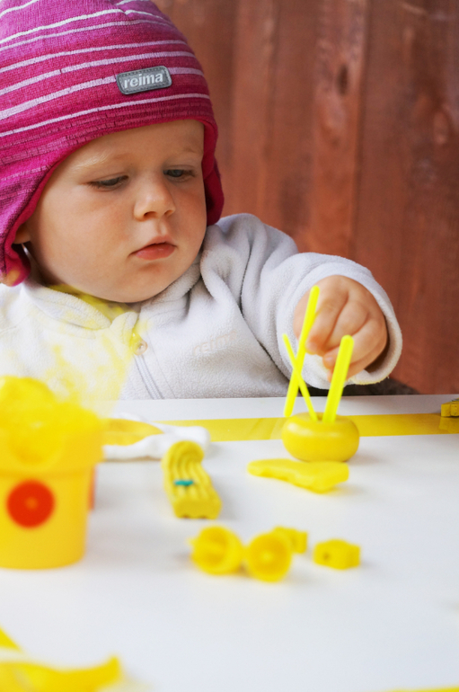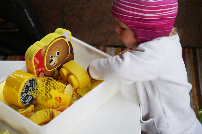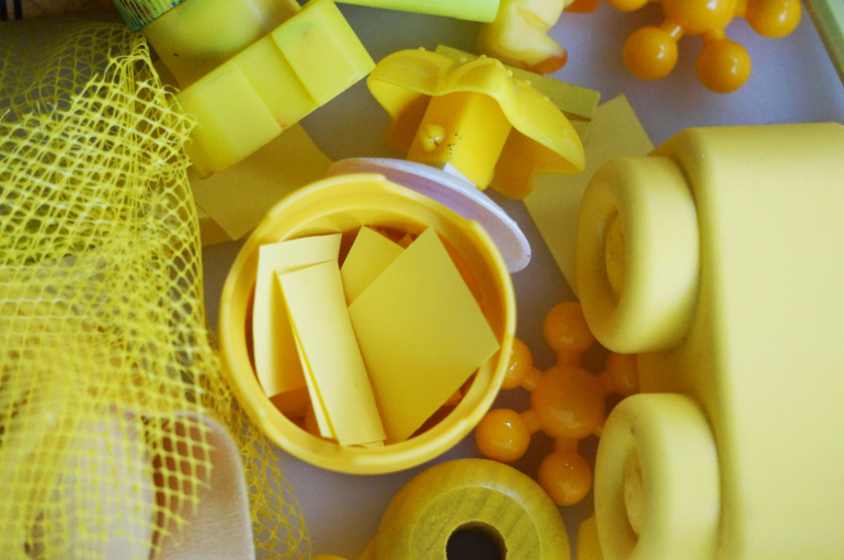 Развитие детей второго года жизниНа днях Маше будет 1,7, но мы до сих пор плохо различаем даже базовые цвета, хотя некоторые в это время уже палитры по пантонам раскладывают. Я внутри долго сопротивлялась тематическим дням по цветам, как-то это казалось слишком навязчивым, а я больше люблю разнообразные, порой интуитивные занятия. Решилась, сегодня хмурым дождливым деньком, мы занялись ЖЕЛТЫМ цветом. Сенсорная коробка с желтыми предметами - любопытно, как привычные для ребенка вещи, принимают новый окрас в такой подаче. Игра рождалась на ходу, креативности добавил желтый скотч, который мы сразу наклеили на стол в виде дороги. Коробка заняла Машу на долго, а потом у нас был желтый ледовый суп для Мишки! К вечеру дочь показывала на желтые занавески, тарелки и другие предметы быта! Однозначно, будем изучать так цвета дальше!
