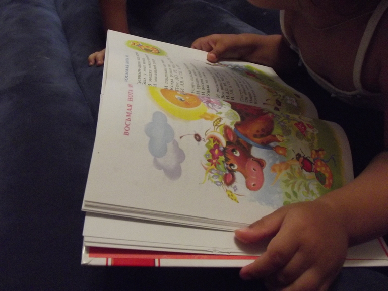 Затем мы перешли к рисованию - это одно из самых любимых наших занятий. Взяли краску,арт-листы из Творчества, влажные салфетки и начали рисовать корове пальчиками пятнышки. Наконец пришла очередь книг. Нам в помощь стих Усачёва «Восьмая нота МУ».