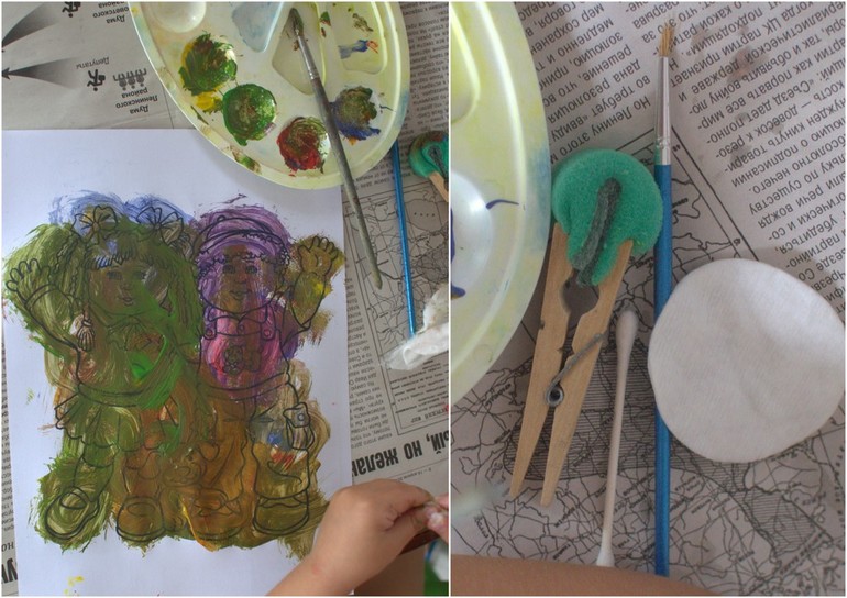 Раскрашивали деток (дала разные материалы, но Алиса в основном обычной кистью намалякала:))