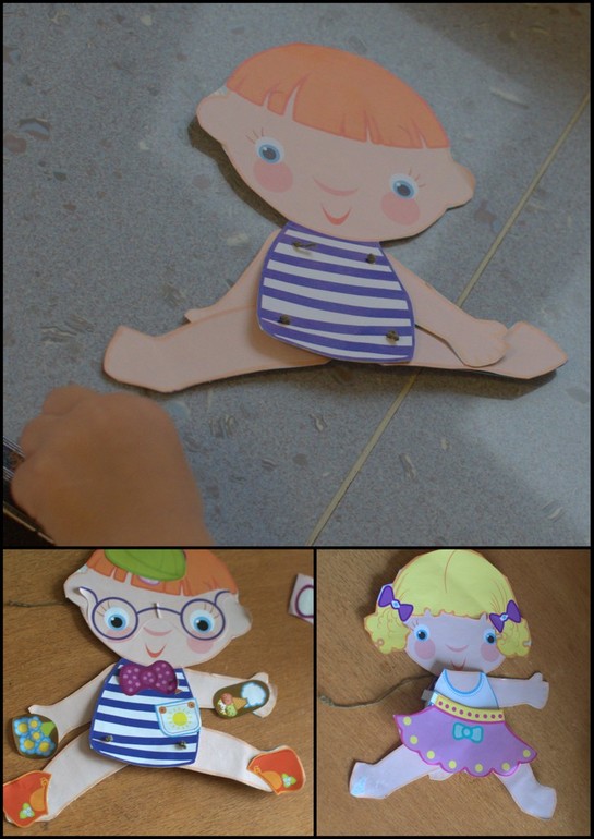 Вырезали, собрали на ниточкам мальчика из журнала. Нарядили его в девочку и набаловались с наклейками