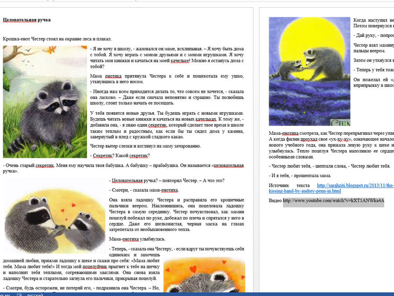 Почитали в Kissing hand, я туда добавила картинок (единственное, целующая заменила на целовательная:))и школу на дс). Попробуем как ритуал использовать. Еще на послушали, но Алиса вся извертелась, честно говоря.